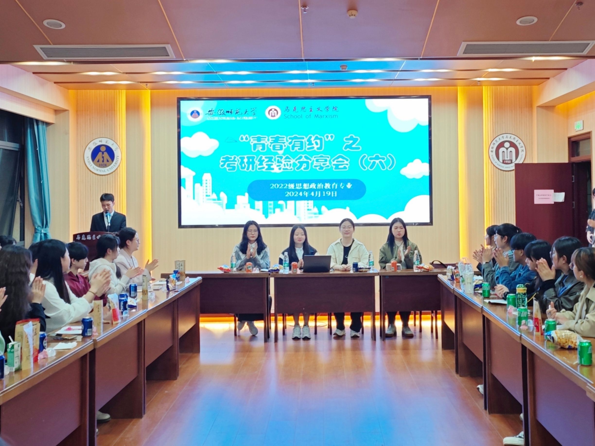 4月19日晚,2022级思想政治教育专业在文典楼G108报告厅开展“红色移动课堂”一站式学生社区青春有约之考研经验分享交流会,2020级本科生俞晶晶、张巧、王东和谭怡应邀主讲。