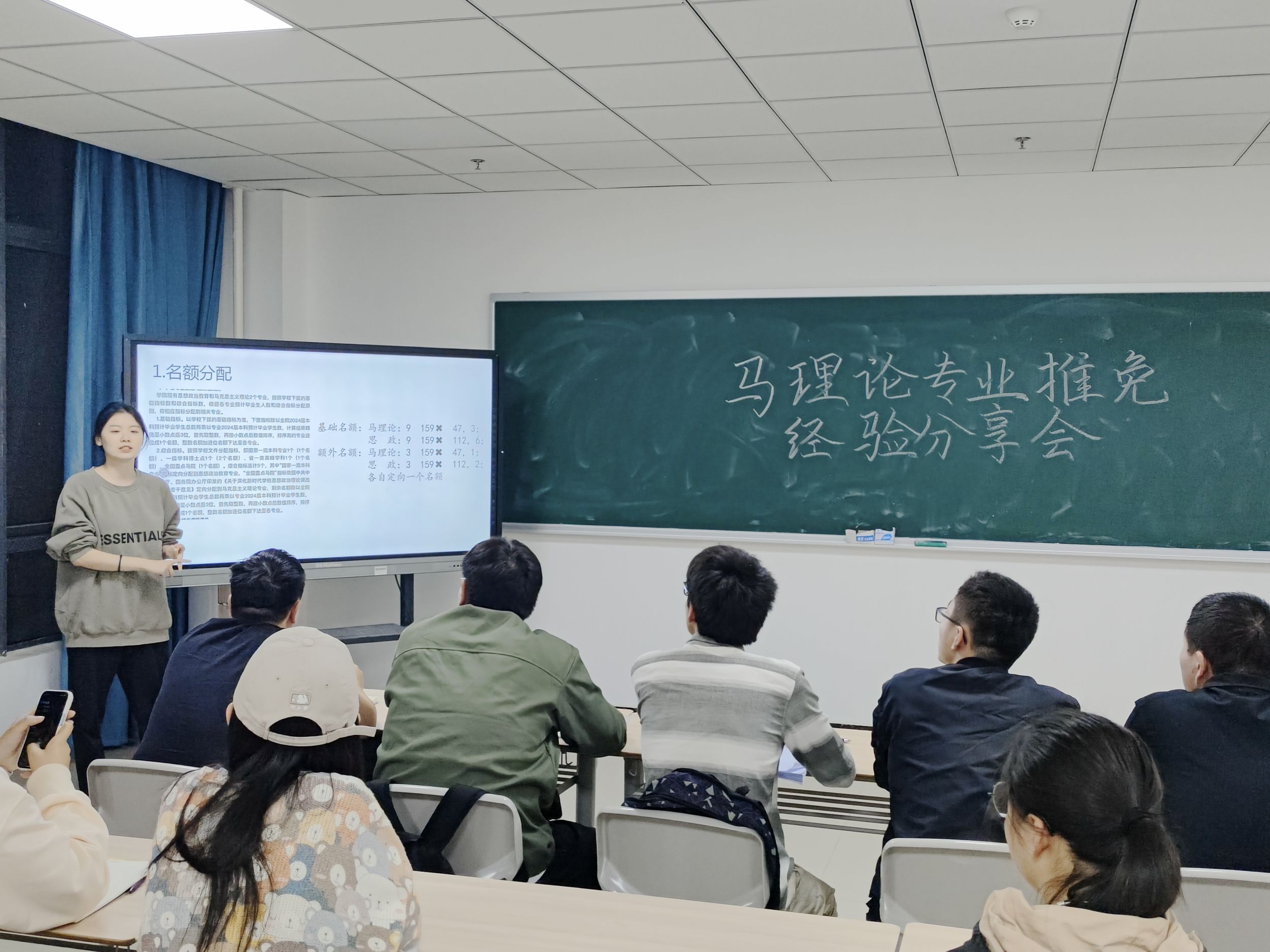 4月24日晚,2021级马克思主义理论专业在马院G109教室召开马理论专业保研经验分享会。2020级本科生应雨萱、时可应邀主讲,会议由 2021级本科生辅导员沈镇主持。