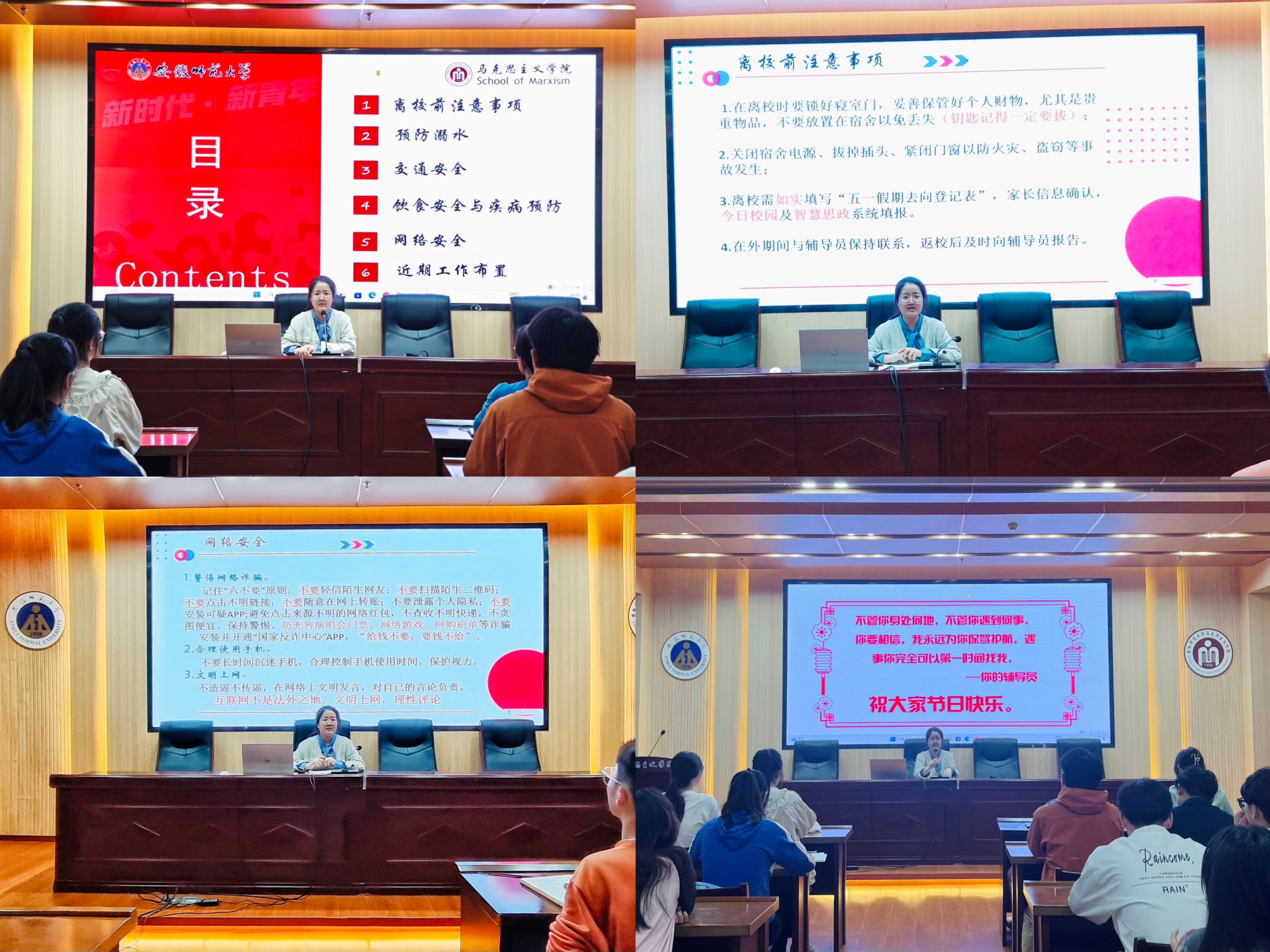 会上,陶娴静从离校前注意事项、预防溺水、交通安全、饮食安全与疾病预防、网络安全、近期工作布置等六个方面展开讲述。陶娴静要求同学们及时在今日校园和智慧思政系统上完成离返校信息填写,叮嘱同学们遇到紧急情况或危机情况要及时上报。陶娴静着重强调假期防溺水、防诈骗、交通安全、消防安全等,提醒假期留校的同学严格遵守学生宿舍管理规定。