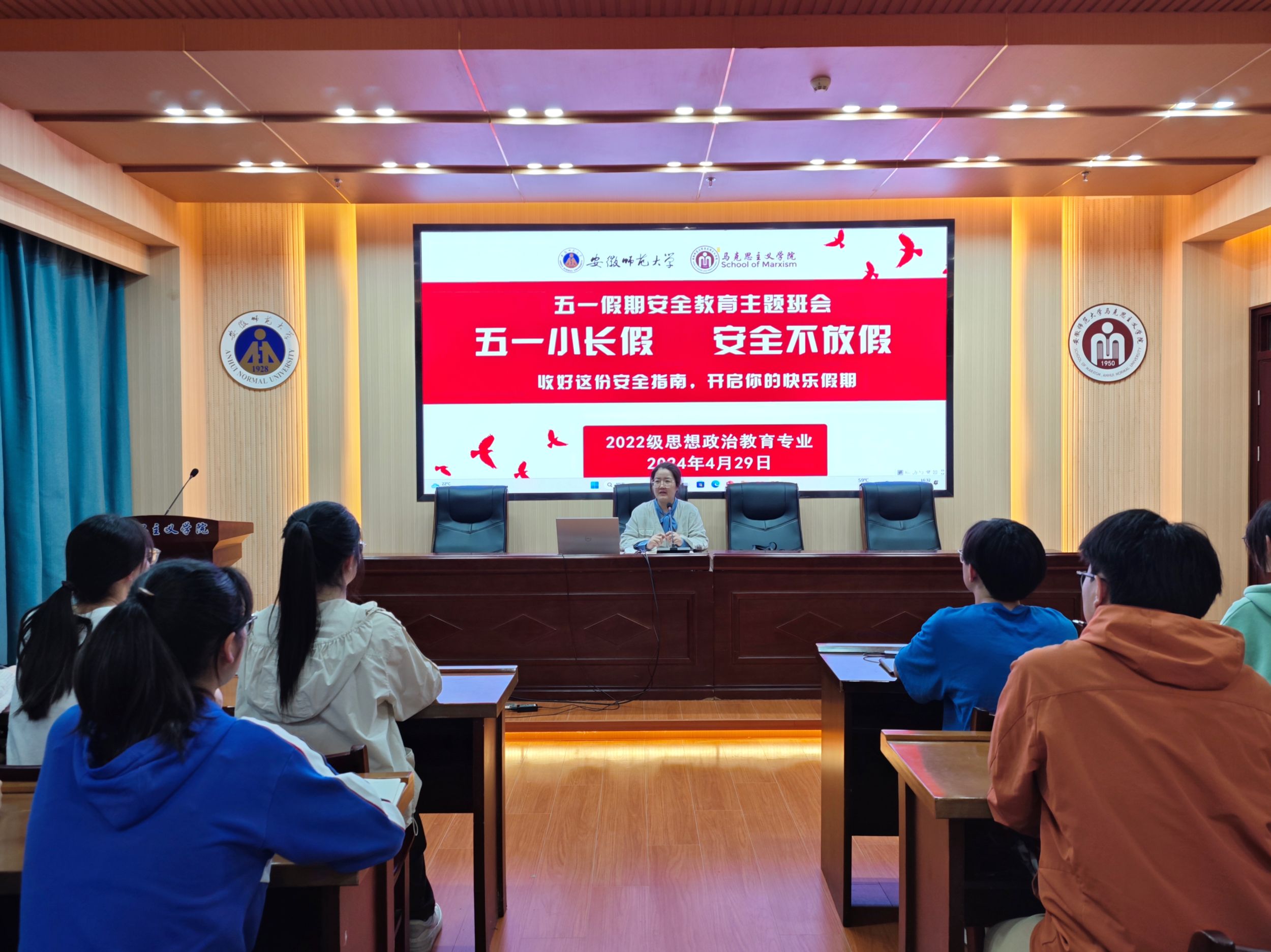 为加强学生安全意识,确保学生度过一个安全、愉快、有意义的假期,4月29日下午,2022级思想政治教育专业在学院G108会议室开展五一假期安全教育主题班会。班会由辅导员陶娴静主持,全体同学参加。