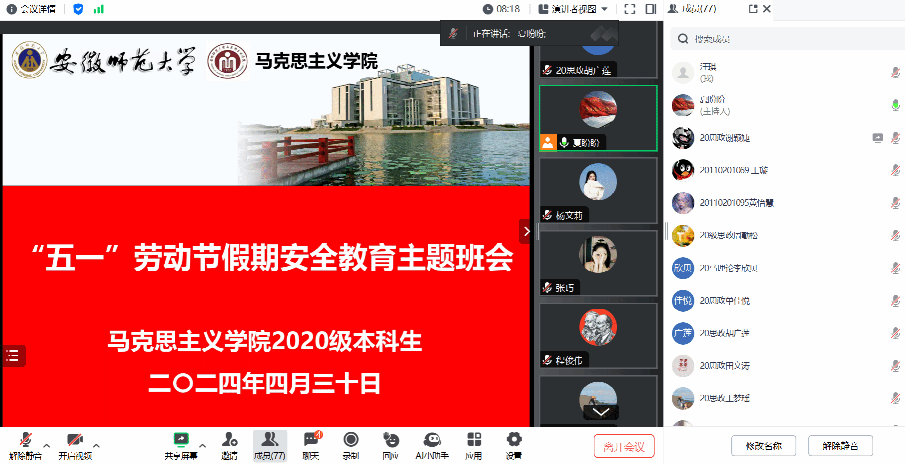 4月30日,永利集团304am2020级本科生于线上召开了“五一”劳动节假期安全教育主题班会,会议由2020级本科生辅导员夏盼盼主讲,全体2020级本科生参加。