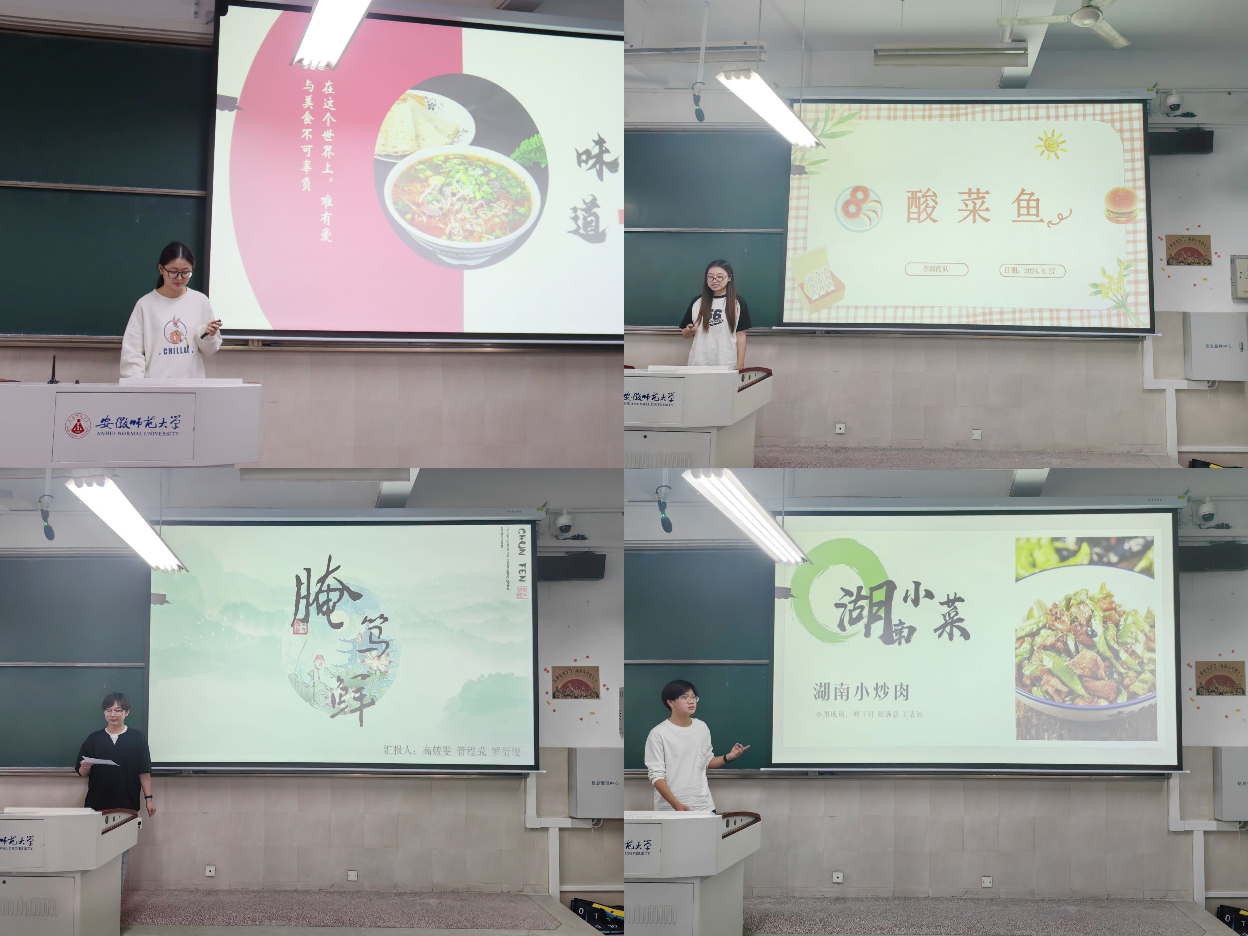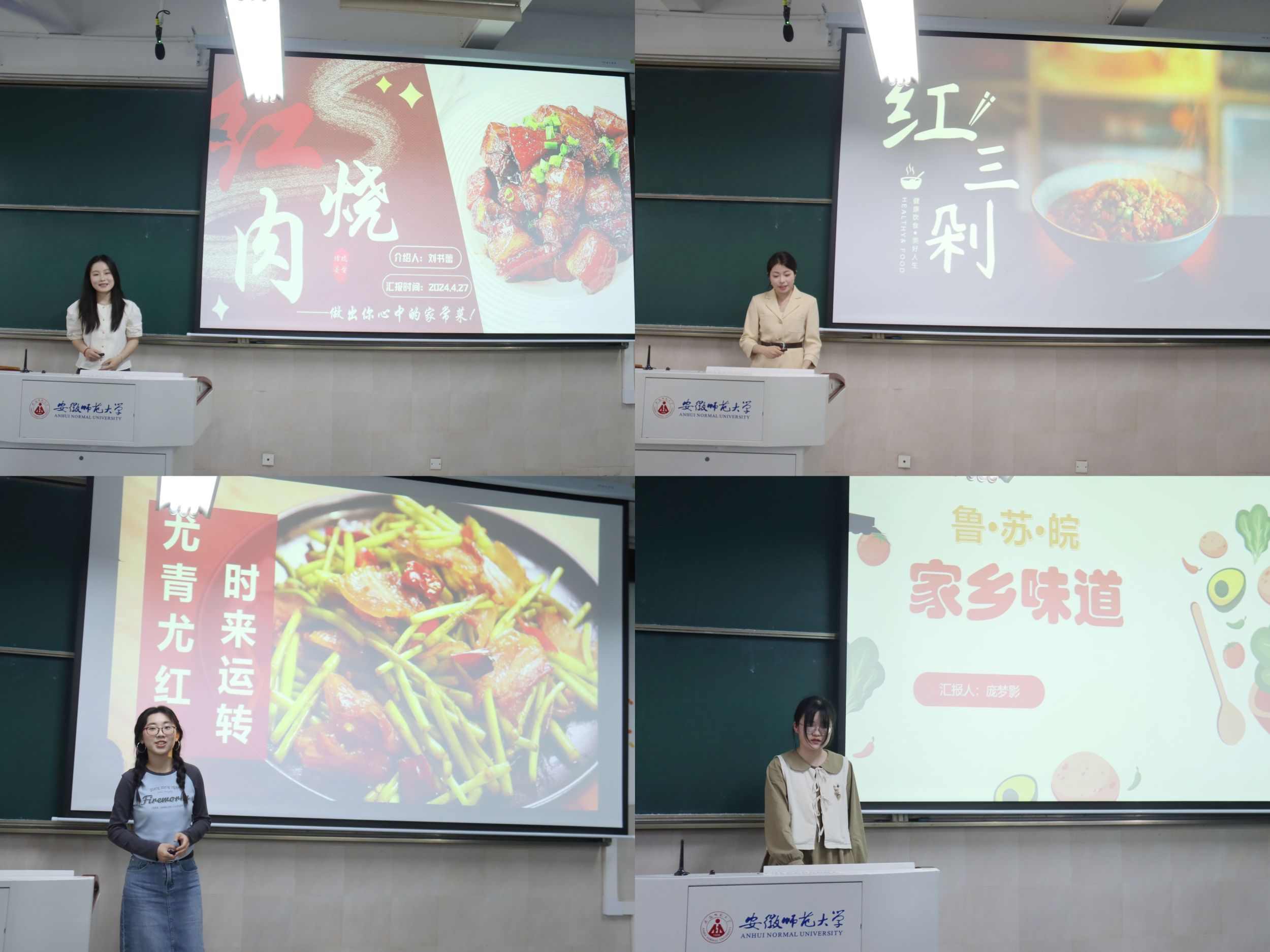 本次比赛以PPT汇报形式进行,参赛选手分别介绍家乡特色菜品的制作过程、食材选择以及背后的文化背景、文化内涵。一方水土养一方人,百样佳肴蕴百样情。选手们以食会友,以食寄情,一道道饱含乡土情感的家乡特色佳肴展现了各地不同的人文底蕴。