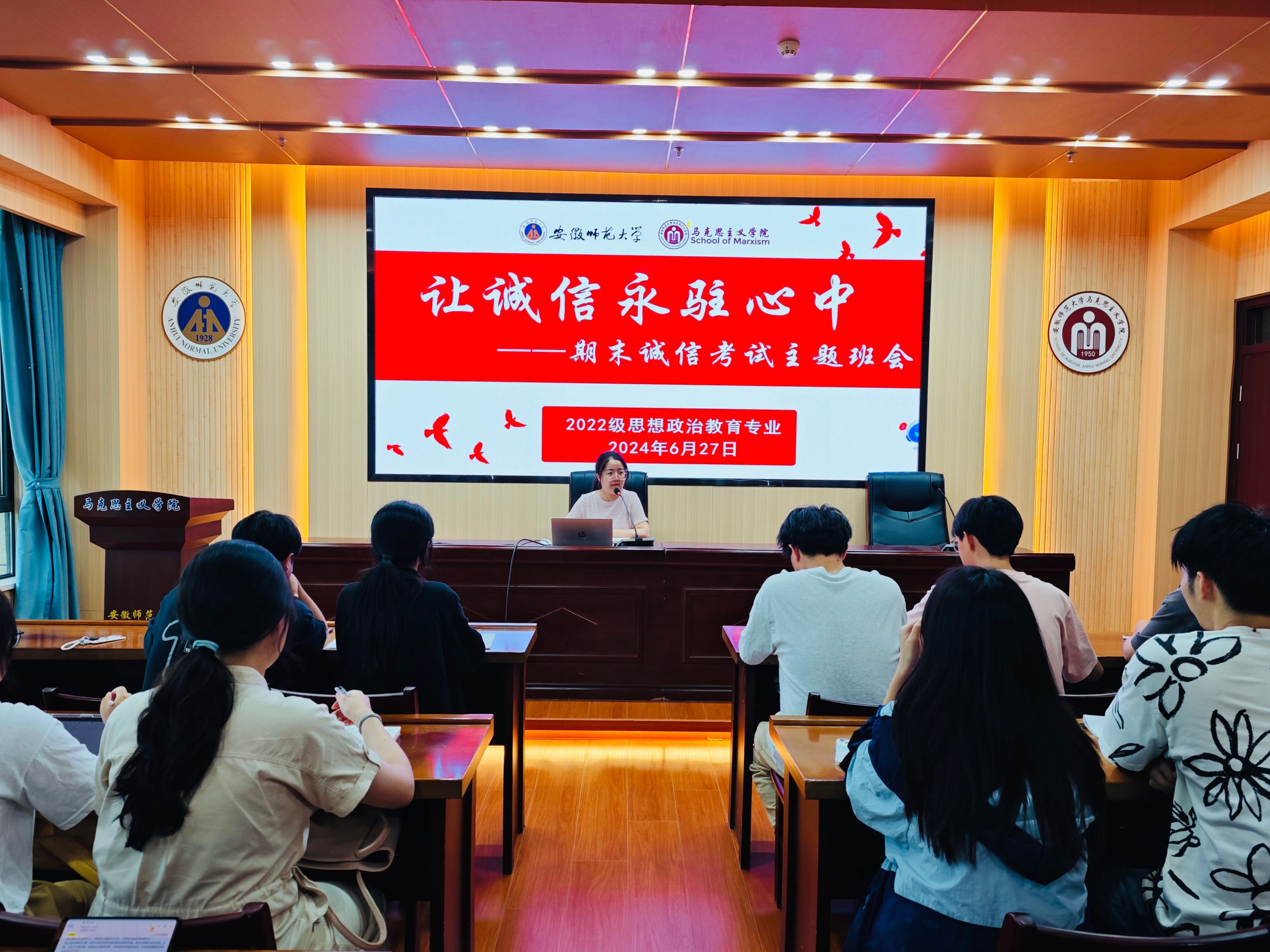 6月27日下午,2022级思想政治教育专业于学院G108会议室开展“让诚信永驻心中”期末诚信教育考试主题班会,会议由辅导员陶娴静主持,全体同学参加。