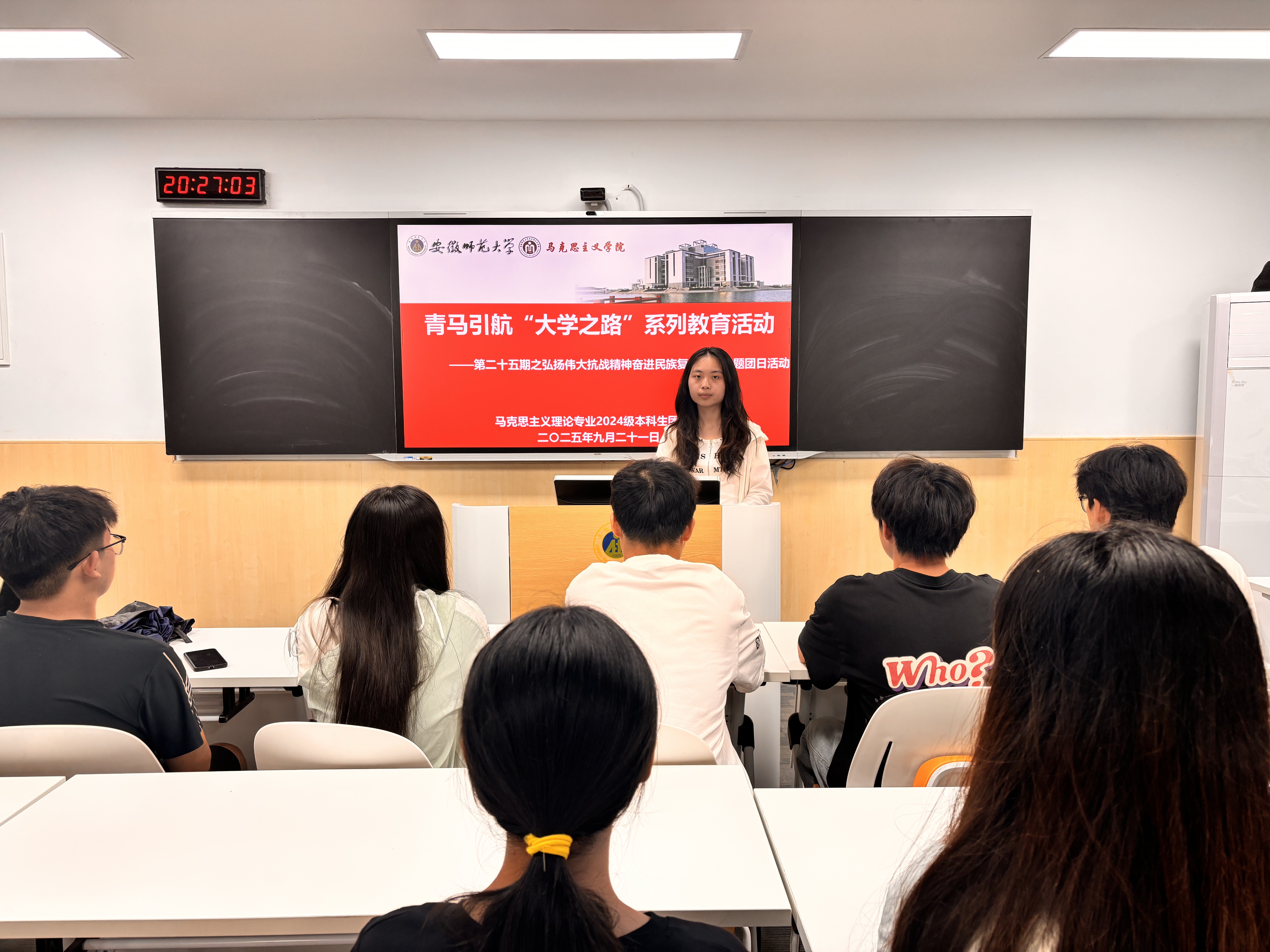 为纪念中国人民抗日战争暨世界反法西斯战争胜利80周年,深切缅怀抗战先烈,传承和弘扬伟大抗战精神,9月21日晚,2024级马克思主义理论专业在望道楼D401教室召开了弘扬伟大抗战精神奋进民族复兴伟业主题团日活动。本次活动由团支书陈沁茹主持,班级全体同学参加。
