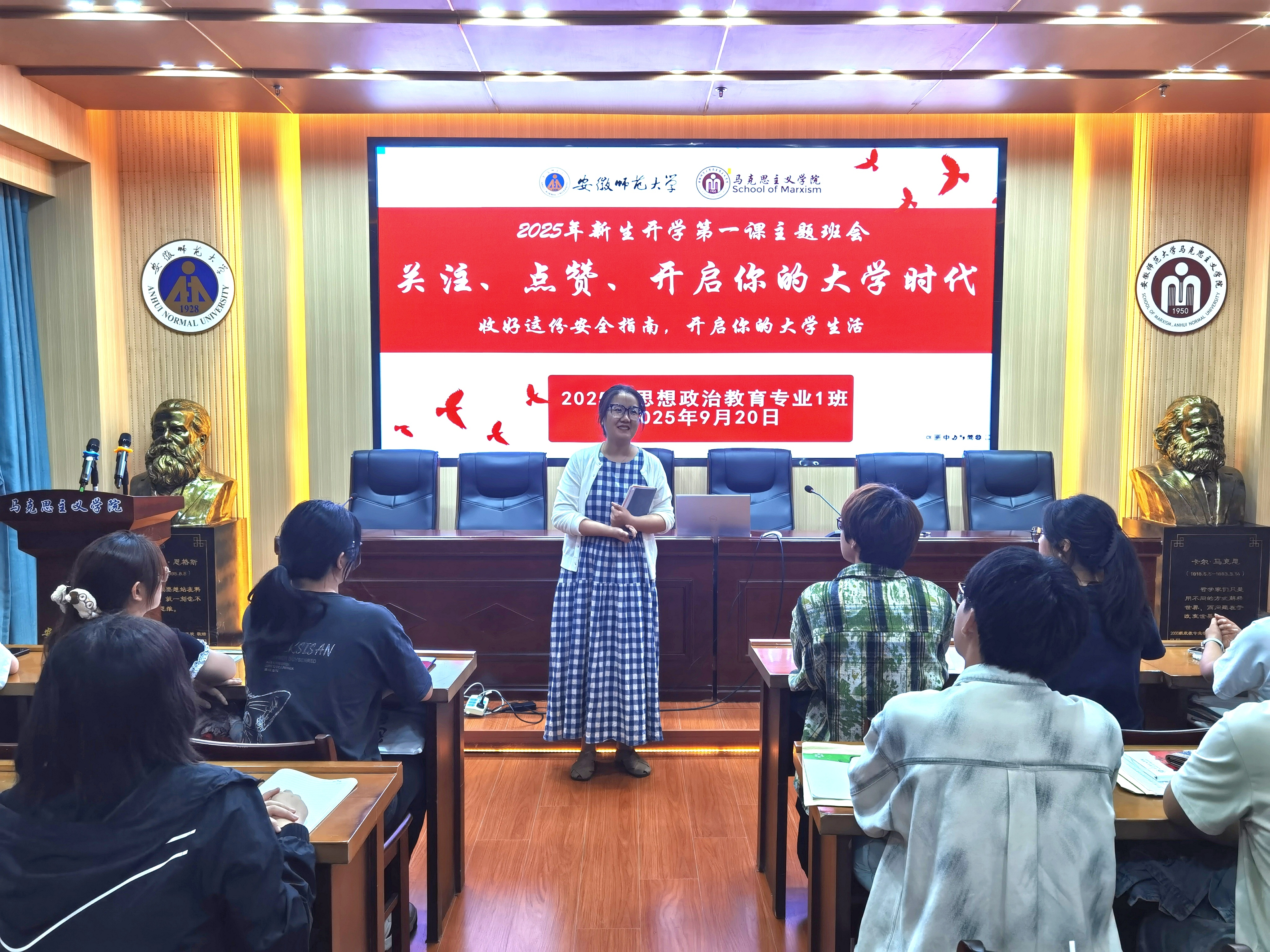 为帮助和引导新生适应大学生活,9月20日晚,2025级思想政治教育专业1班在学院G108报告厅召开“关注、点赞、开启你的大学时代”开学第一课主题班会,会议由辅导员陶娴静主讲,全体同学参加。
