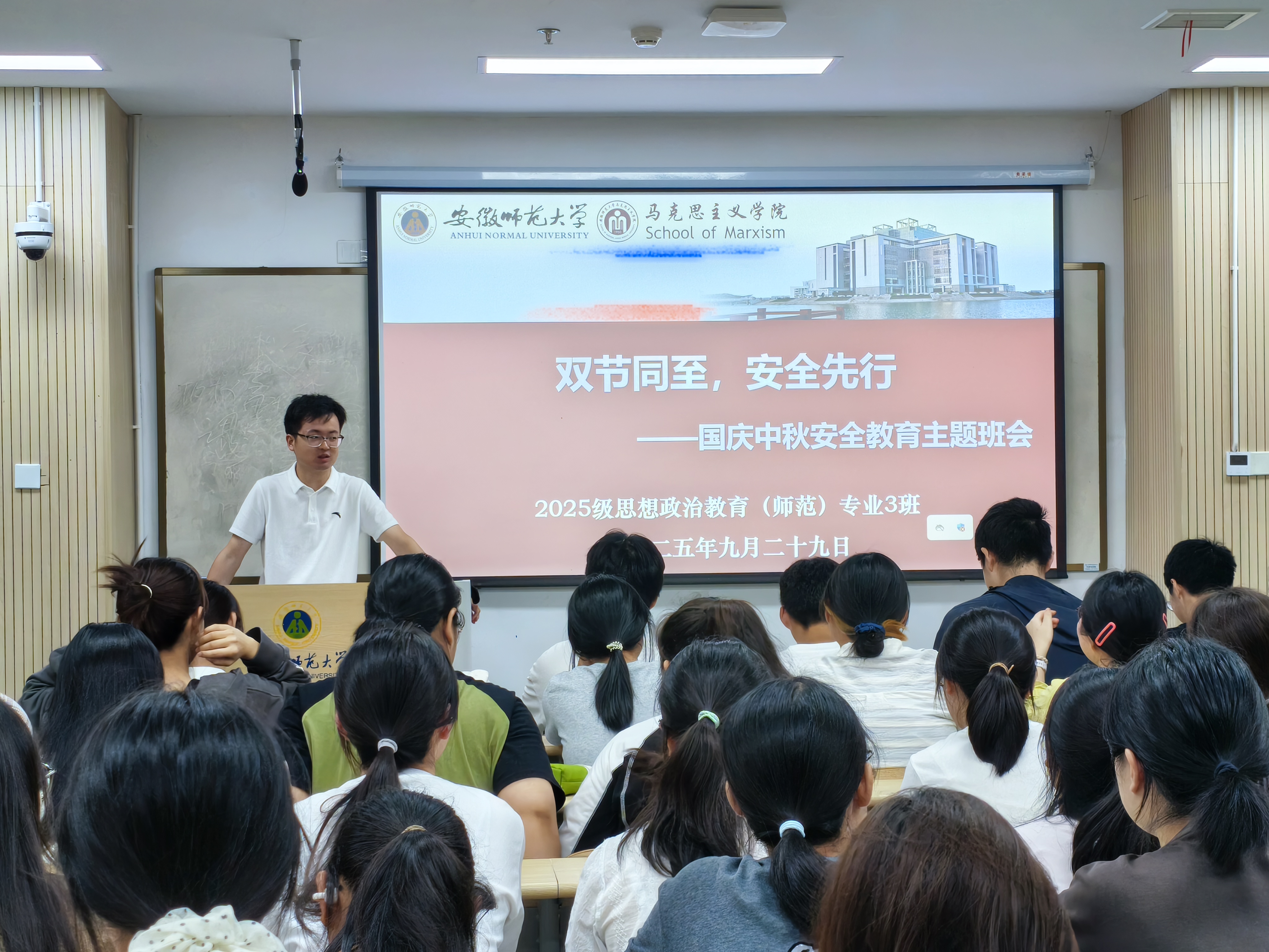 为切实增强学生安全防范意识,保障全体同学度过一个平安、愉快假期,9月29日,永利集团304am2025级思想政治教育专业3班在望道楼E204召开国庆中秋安全教育主题班会。辅导员周勤松主持班会,全体同学参与。