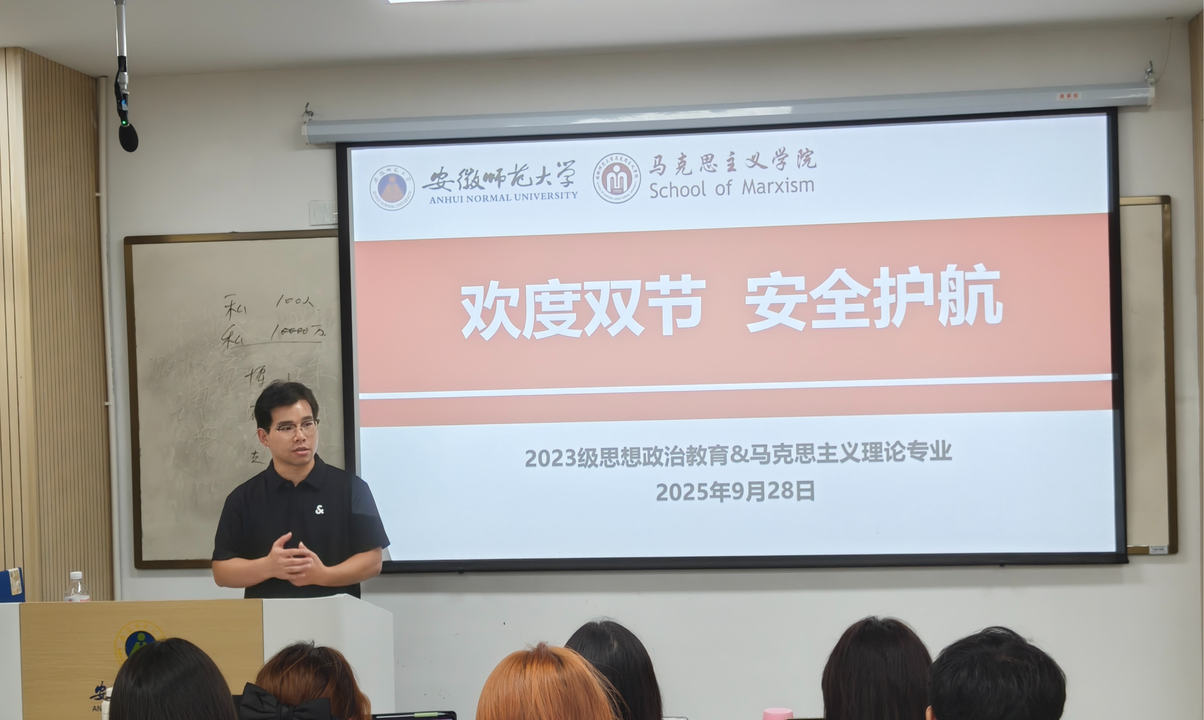 为喜迎国庆、中秋双节,强化学生安全意识,9月28日,2023级本科生于望道楼E205、204开展“欢度双节,安全护航”主题班会。班会由辅导员王梦雨主持,全体学生参加。