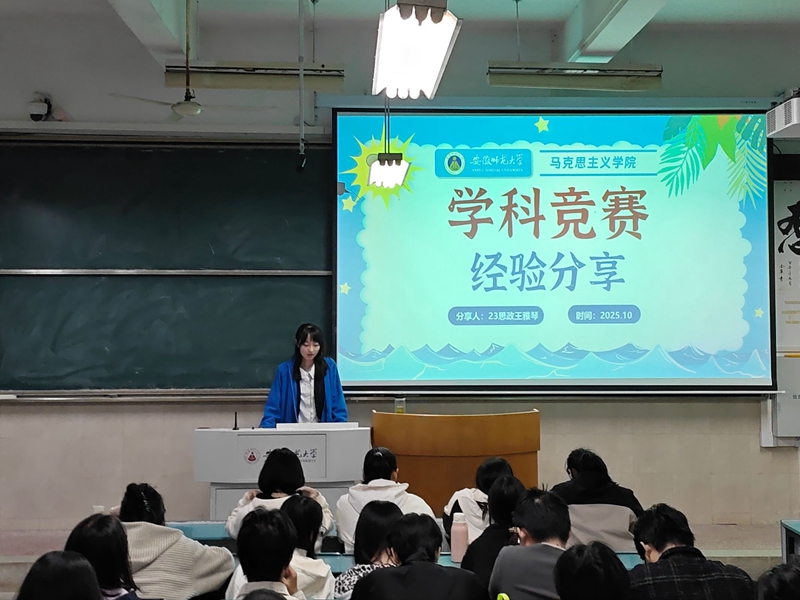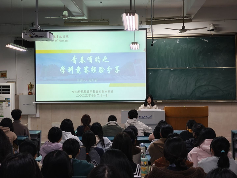 10月21日晚,2024级思想政治教育专业本科班在行知楼2号楼101、102教室举办青春有约之学科竞赛经验分享活动。活动由李梦芸、张硕主持,王雅琴、陈卓青担任主讲,全体同学参与。