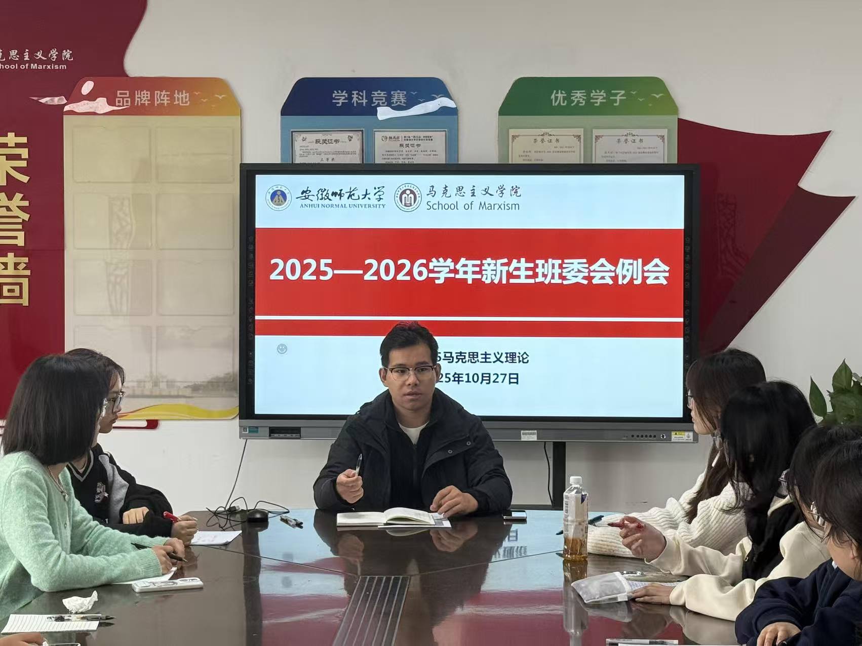 为明确新学期班级建设方向与核心任务,强化班委会成员间的协同配合,10月27日下午,2025级马克思主义理论专业1班在学院本科生党支部组织召开2025-2026学年第一学期班委工作部署会。此次会议由辅导员王梦雨主持,全体班委会成员参会。