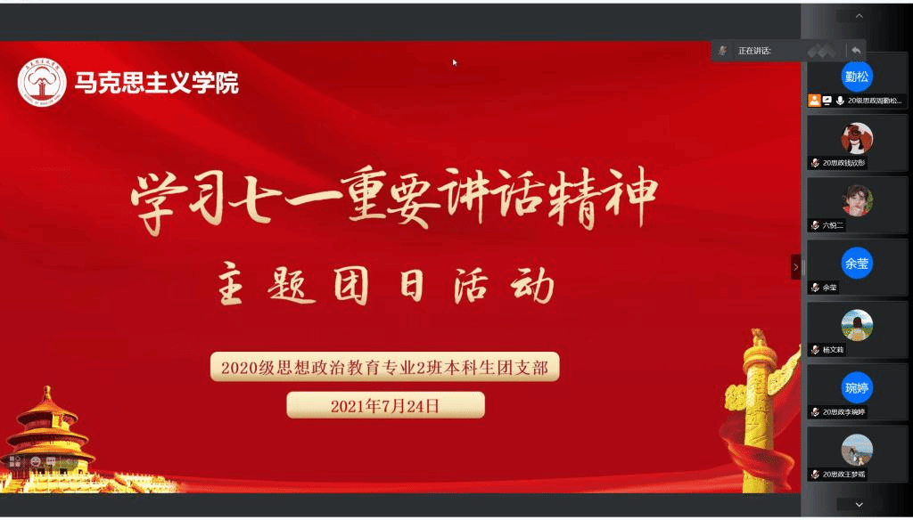 本网讯(文/钱欣彤 摄/钱欣彤)7月24日下午,学院20级政教第二团支部举办了学习“七一”讲话精神主题团日活动。本次活动以线上方式展开,团支书周勤松同学担任主讲人,20级政教第二团支部全体同学参加会议。