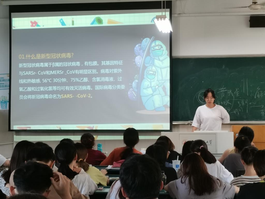 许雯同学先向大家科普了新冠肺炎的相关知识,并提醒大家要注意个人防护,严格遵守疫情下的校园安全管理要求等相关制度。最后,许雯向大家介绍了几点健康防护知识,如正确选择和佩戴口罩、如何正确洗手和防护自检。天气转凉,许雯同学提醒大家要注意防寒保暖,及时增减衣物,预防感冒。