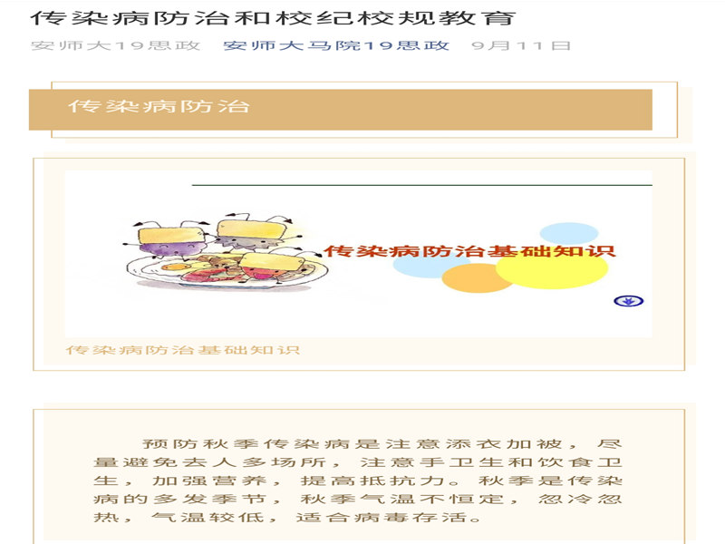 各年级、班级积极进行搬迁宿舍,在集体劳动中互帮互助、团结协作,增进彼此感情、增强班级凝聚力,促进宿舍搬迁圆满完成。在日常卫生打扫中,各年级、班级严格进行教室卫生清扫、宿舍打扫,学院还成立院学生会文明督查小组对安全卫生进行常态化督查,真正做到全覆盖、无遗漏、零死角,营造了整洁干净的学习、生活环境。19政教微信公众号还推送传染病防治相关内容,引导学生养成良好的卫生习惯和生活习惯,进一步巩固新冠肺炎疫情防控成果,从源头上控制疾病的发生与传播。