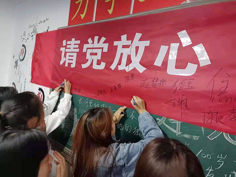 活动最后,葛瑞萍带领全体与会团员青年在团旗下重温入团誓词,并在“请党放心 强国有我”主题横幅上签名寄语。