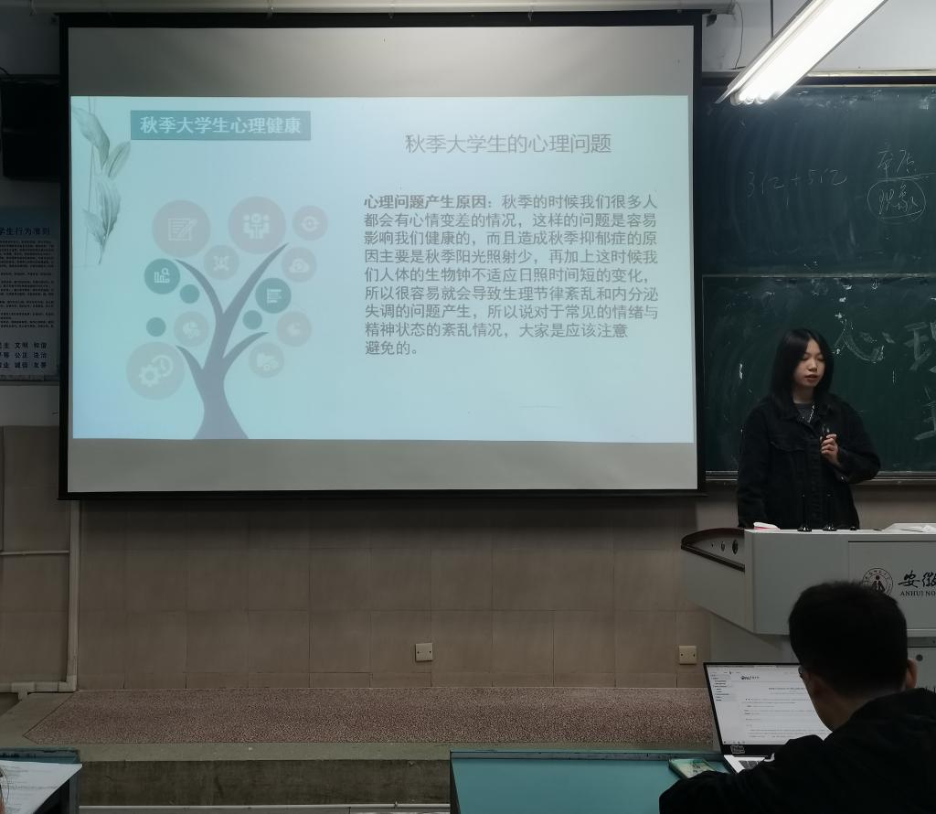 会上,由杨璇同学带领大家了解当代大学生心理健康现状,阐述了大学生常见的心理问题。廖诗雨同学主要阐述大学生该如何拥有健康心理,强调了锻炼身体的对于调节身心状态、拥有良好心理的重要作用。