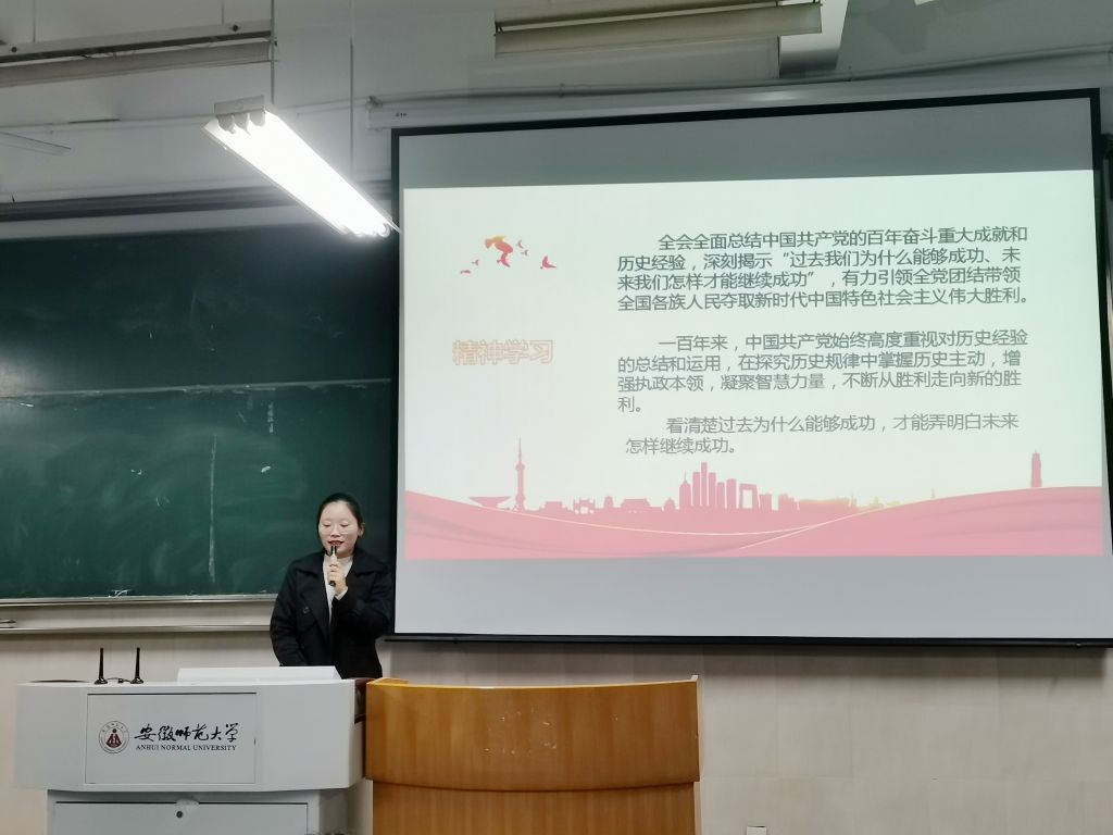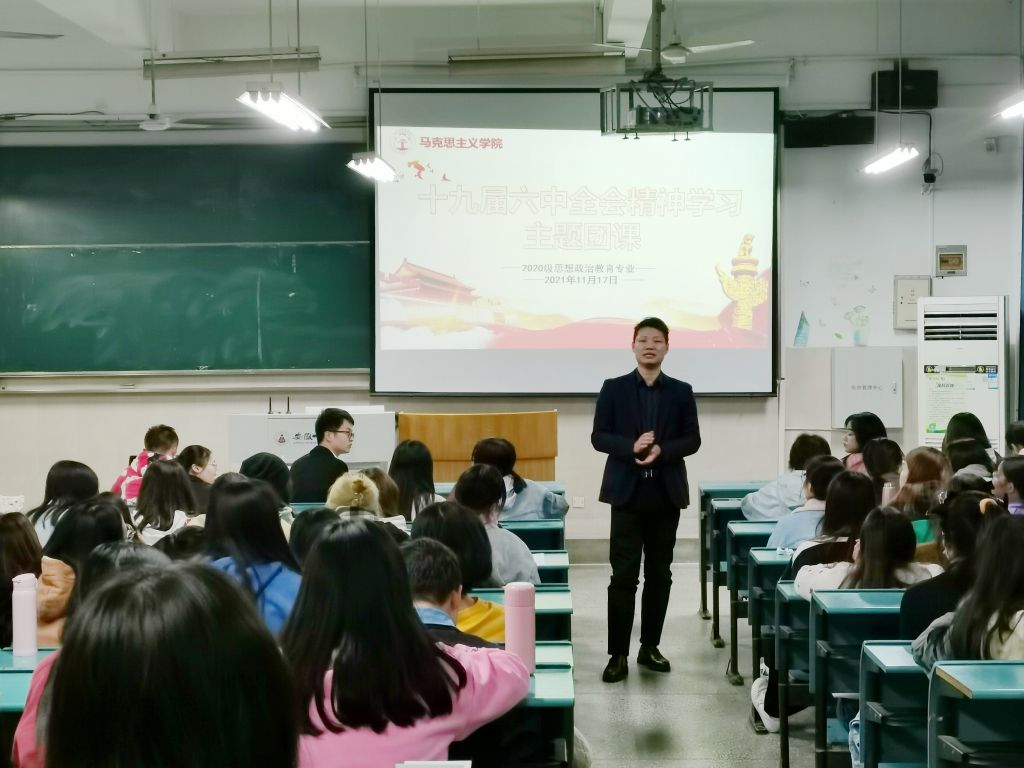 本网讯(文/摄 方乙婷) 为洞察历史规律、汲取前行力量,11月17日晚,2020级思想政治教育专业在2020203教室开展中国共产党十九届六中全会精神学习主题团课。