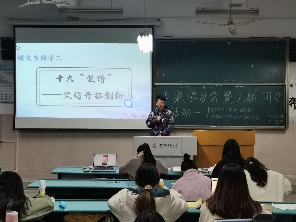 本次活动分为《决议》领学和交流分享两个部分进行。团支书周勤松从整体上介绍了《决议》的基本框架与基本内容,并用具体数据进行解读。团支书杨占婕和周勤松依次领学《决议》中的“新时代的中国共产党”和十大“坚持”中的坚持开拓创新部分。杨占婕表示,《决议》发出了新时代中国共产党人牢记初心使命、坚持和发展中国特色社会主义的政治宣言,要大力弘扬伟大建党精神。周勤松播放了有关坚持开拓创新的视频,强调只有把开拓创新作为干事创业的常态,敢闯敢试、不怕艰险,才能更好地涉险滩、渡难关、创奇迹。