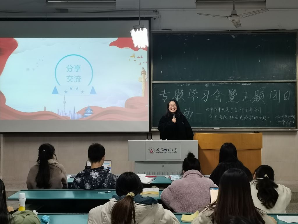 本网讯(文/方乙婷 摄/马雅芸) 11月30日,20级思想政治教育专业全体同学在行知楼2020204教室举办十九届六中全会精神专题学习会暨主题团日活动——学习《中共中央关于党的百年奋斗重大成就和历史经验的决议》。