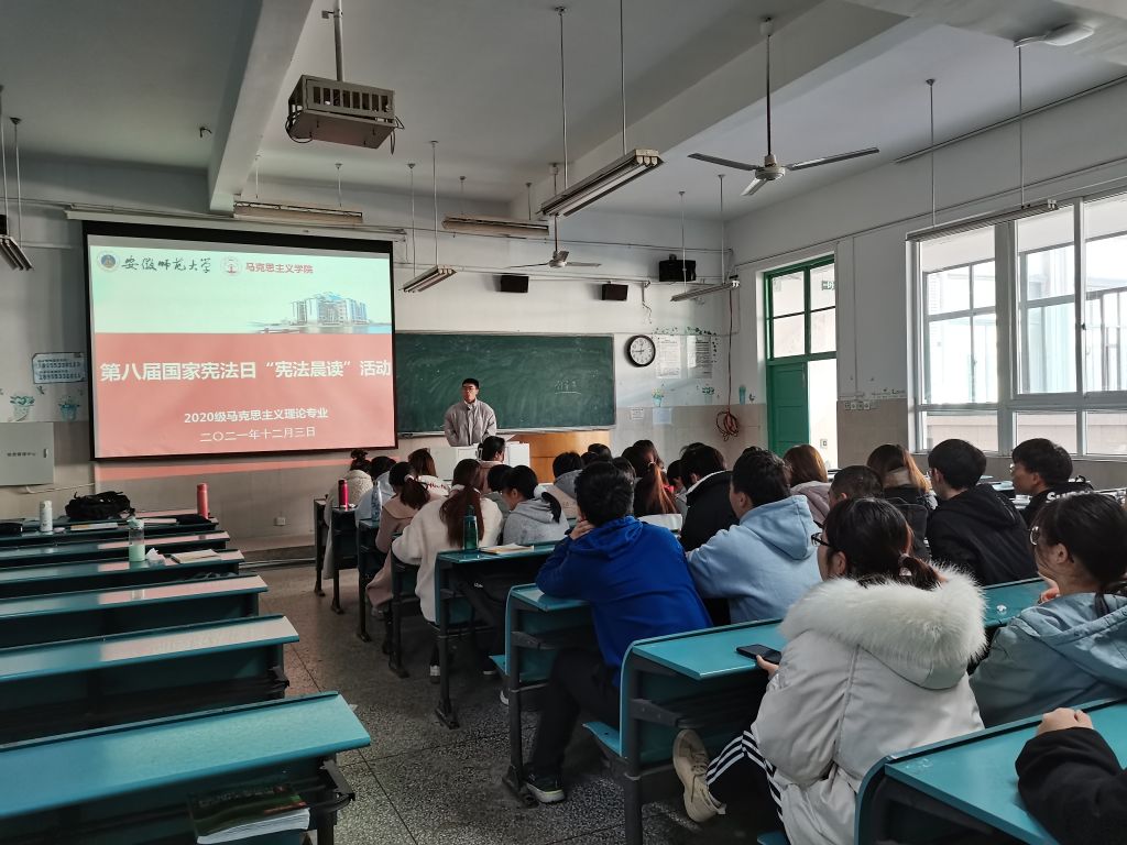 本网讯(文/摄 刘倩倩)12月3日早晨,20级马克思主义理论专业的同学在教学楼2020405教室进行了一次宪法晨读活动。此次活动由班长任健宝同学主持,马理论专业全体同学参加。