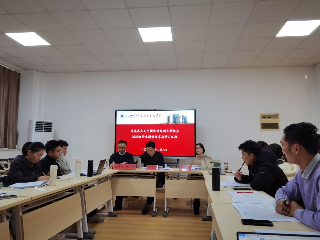 (文/摄/周晏)12月8日下午,马克思主义中国化研究硕士学位点2020级学生在学院党史研究室召开阅读分享与学习汇报会。马克思主义中国化研究硕士学位点导师李祥兴、沈燕培担任此次汇报会的点评人,由马克思主义中国化研究硕士学位点点长郭理主持本次汇报会,2020级马克思主义中国化研究方向全体同学参加汇报。