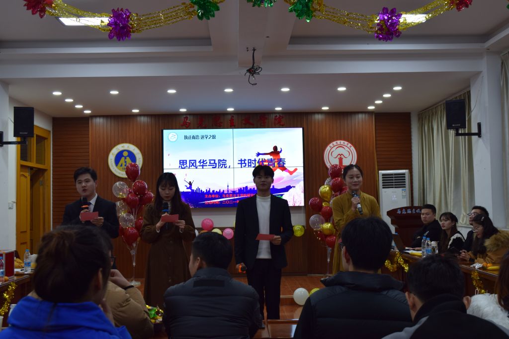 本网讯(文/赵兵 摄/张桂妹)12月14日晚,学院研究生会在学院五楼报告厅举办了以“思风华马院,书时代青春”为主题的研究生茶话会。本次茶话会邀请了往届学长、学姐参加,院研究生会全体成员共同参与。活动由张猛、赵星辰、张安琪、李亚楠主持。