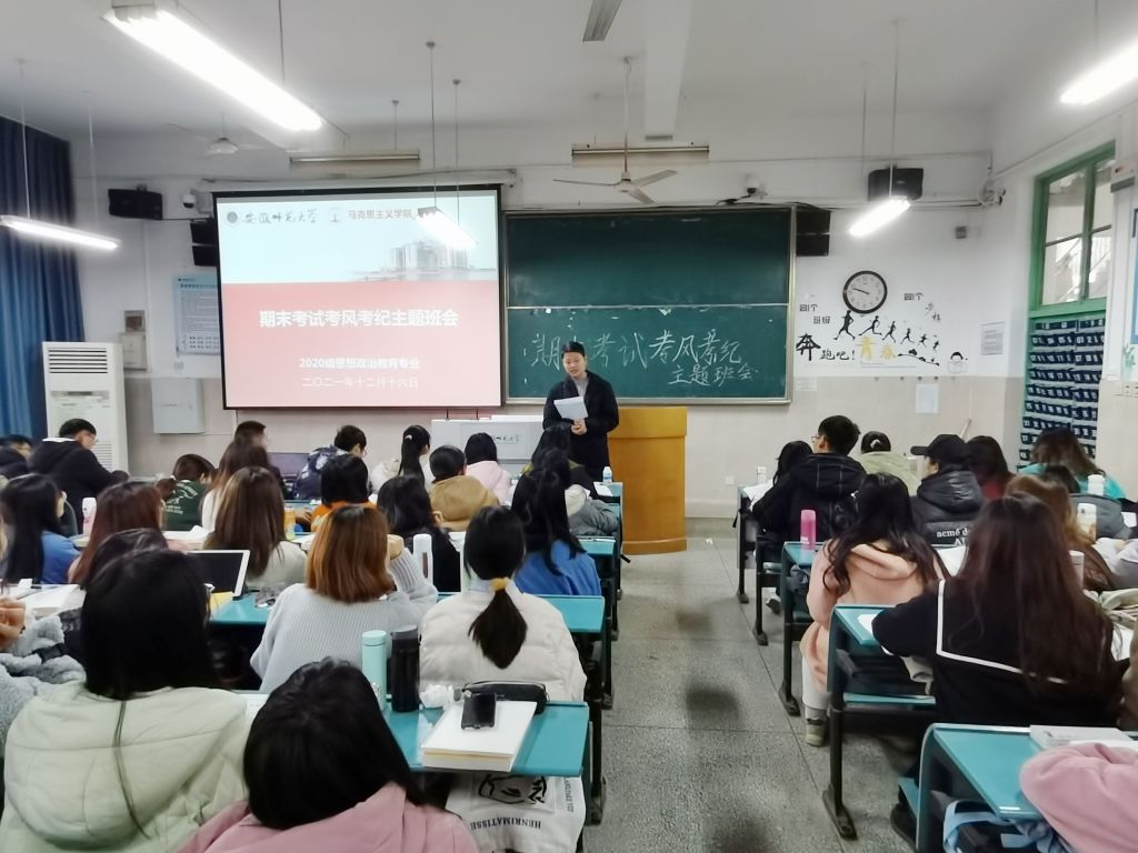本网讯(文/摄 马雅芸)期末考试即将到来,为了加强考试纪律要求,12月16日上午,20级思想政治教育专业全体同学在行知楼2020204教室召开考风考纪主题班会,班会由辅导员夏盼盼老师主持。