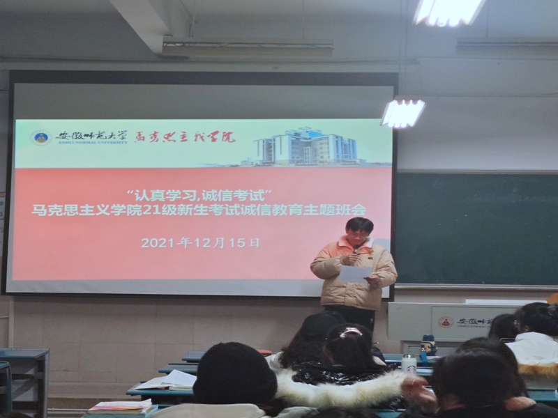 本网讯(文/摄赵慧颖)为践行社会主义核心价值观,引导同学们共同建设诚信学风,12月15日晚,马院21级新生在二号教学楼203、404、405教室依次开展了以“认真学习、诚信考试”为主题的诚信教育主题班会。会议由辅导员沈镇主持,马院21级全体同学参加。