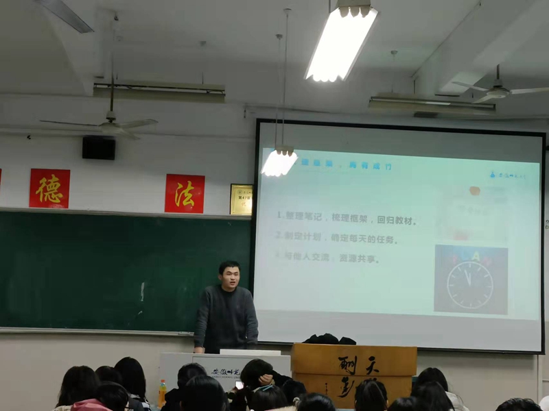 李勇超从即将到来的英语四级考试讲起,讲述了一些考四级的技巧,比如写题的顺序、考试的心态、时间的分配等。建议大家读一些英文的文章,把单词放在特定的语境进行记忆,不能看成独立的个体。黄博文根据自己以往期末考试的经验,告诉大家自己的答题方法、技巧,考试前复习要有计划,划重点复习。以大学生思想道德修养为例,要认真对待考试,了解对应学科的性质、特点,有步骤、有目的地加以复习。时可从马克思主义哲学、逻辑学、法学概论等专业课如何答题、熟悉题型等方面介绍考试的具体过程。让同学们了解学情,不要焦虑。此外,三位学长学姐还介绍到关于保研的相关内容和要求,激励同学们努力学习。