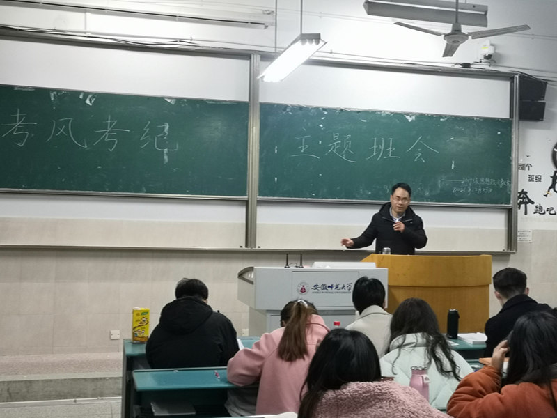 本网讯(文/摄 唐婉玉)为端正考纪,严明考风,12月23日晚,19级思想政治教育专业于行知楼2020204教室举办考风考纪主题班会。本次班会由辅导员周楠主讲。2019级全体本科生参加。