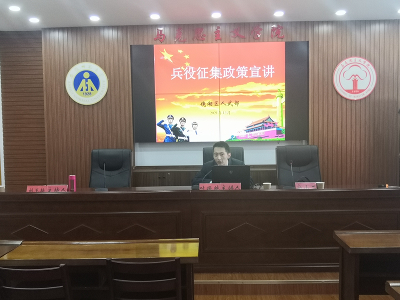 本网讯(文/薛艳茹 摄/初宝璐)为帮助学生了解征兵工作相关知识,提供多种就业选择,12月30日上午,学院于行政楼五楼会议室举办征兵工作政策宣讲会,会议由镜湖区人武部参谋叶振纯担任主讲人,学院党委副书记刘玉艳主持,全体2022届本科毕业生参加。