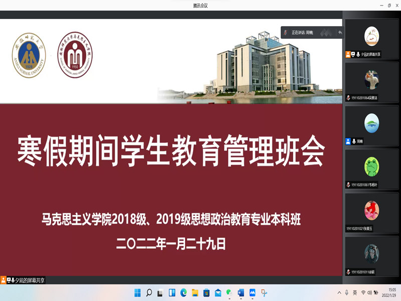 会上,周楠首先强调了今日校园每日健康打卡的重要性和必要性,他指出新年之际,各地疫情形势不稳定,具有极大的风险性,倡议每位同学就地过年,尽量避免前往疫情中高风险区。同时在雨雪天气下,要减少外出,注意出行安全。随后,周楠建议即将在下学期前往实习的19政教学生与学长学姐交流经验,在寒假熟悉实习教材;他提出同学们要在寒假期间加强体育锻炼,为即将到来的开学体测做准备。之后,他结合18政教最后一个学期的各项任务,提醒18政教的同学们注意考研初试成绩的公布和未来职业道路的选择,督促其尽早在寒假完成毕业论文的初稿和开题报告,为大学最后一个学期的诸多任务做好准备。最后,周楠再次强调同学们在寒假期间保持自身安全的同时要认真完成假期各项重要任务,安全过新年,开心过新年。