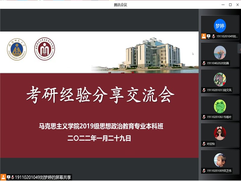 本网讯(文/摄 刘薇)为增强考研学子的目标意识和方法意识,2019级思想政治教育专业于1月29日晚举办了第二期考研经验分享线上交流会,本次交流会由19级思想政治教育本科生刘梦婷主持,2017级本科毕业生河海大学叶钟昊和中山大学黄希敏应邀主讲,19政教全体本科生参加。