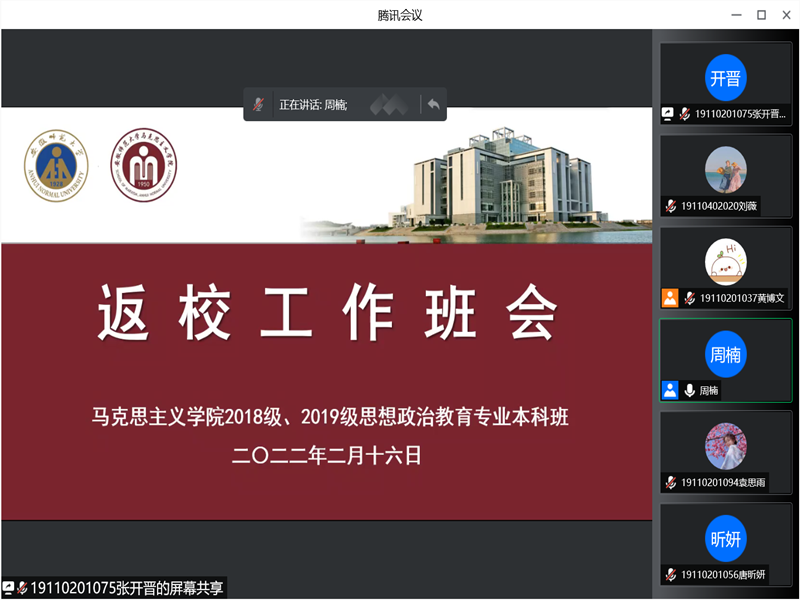 本网讯(文/摄 刘薇)为贯彻落实学校疫情防控工作要求,保障学院2022年春季学期开学工作平稳有序进行,2月16日下午,2018、2019级思想政治教育专业本科班在线上召开返校工作班会。本次班会由辅导员周楠主讲,18、19政教专业全体本科生参加。