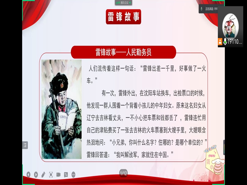 本网讯(文/摄 刘安瑶)为了弘扬雷锋精神,引导同学们深入了解学习雷锋精神的内涵,3月13日晚上,2019级思想政治教育专业本科生团支部在线上举行了主题为“讲雷锋故事,学雷锋精神”的主题团日活动。本次会议由团支书丁小羽主持,19思政全体本科生参加。