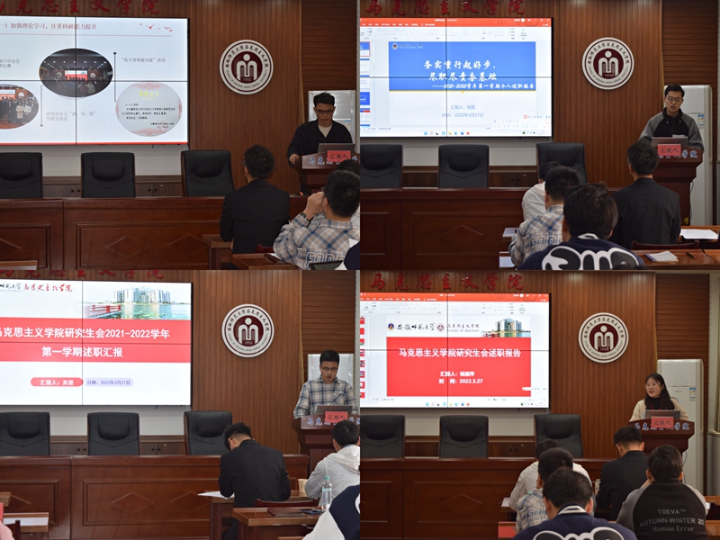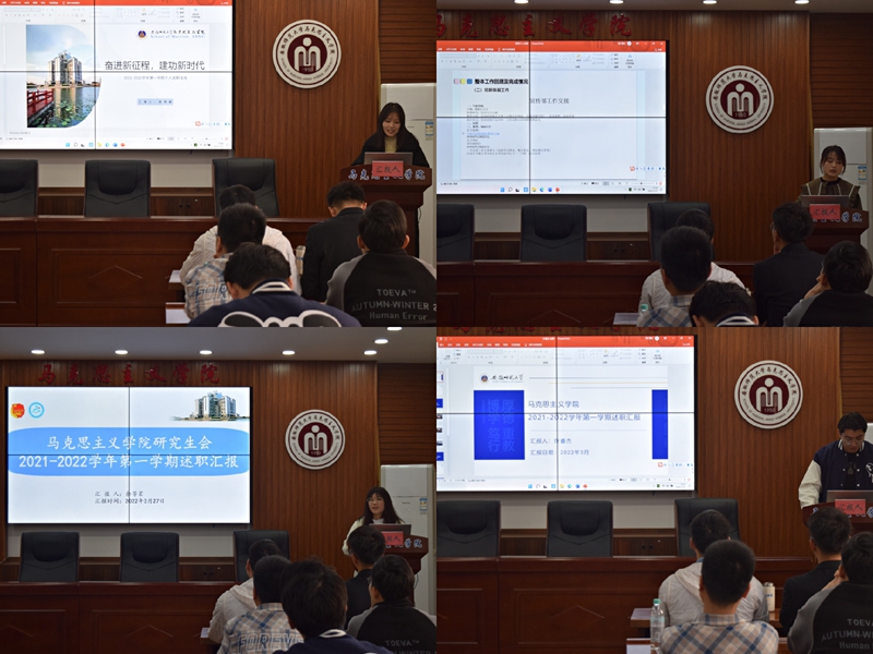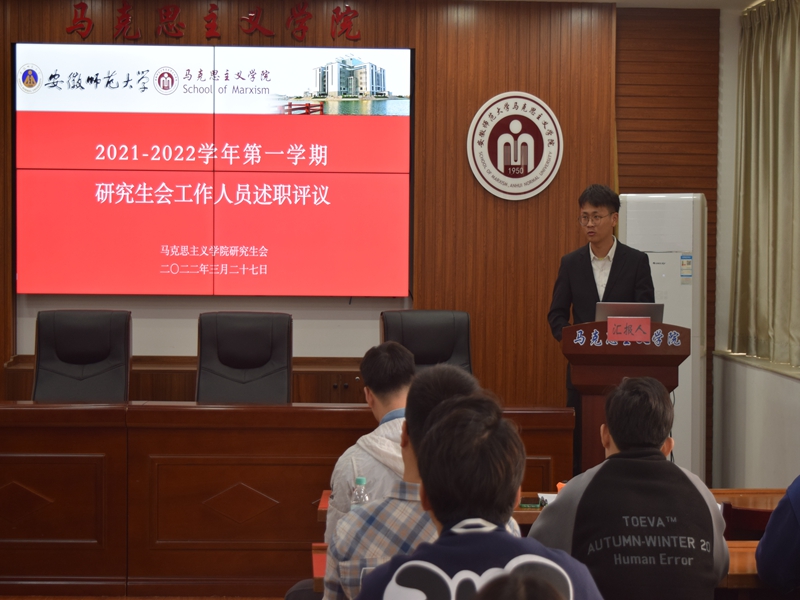 本网讯(文/摄 赵兵)3月27日下午,永利集团304am2021-2022学年第一学期研究生会工作人员述职评议会在学院五楼会议室举行。本次会议由办公室委员陈国伟主持,学院团委书记沈镇、2020级研究生班级班长、团支书、其他班委及各方向专业负责人担任评委,第十届研究生会主席团成员、各部门部长进行述职汇报。