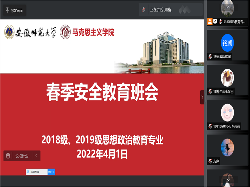 本网讯(文/摄 耿铭澜)4月1日上午,2018级、2019级思想政治教育专业本科班召开线上春季安全教育主题班会。辅导员周楠担任本次班会主讲人,2018级、2019级本科生参加会议。