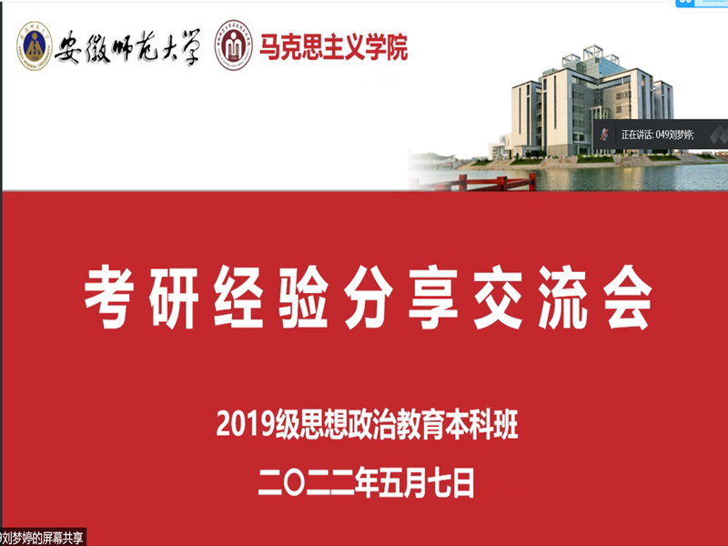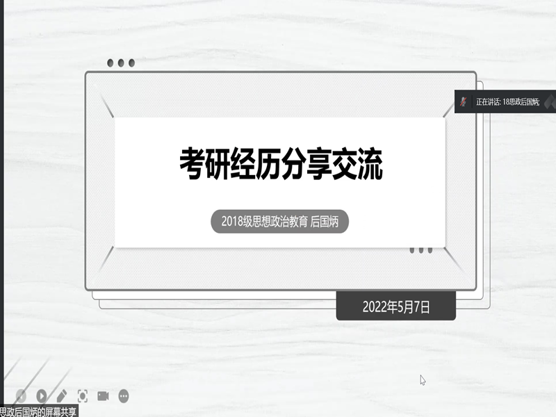 本网讯(文/摄 唐婉玉)5月7日晚,2019级思想政治教育专业举办了第十期考研经验分享线上交流会,本次交流会由思政委员刘梦婷主持,已被东北师范大学录取的2018级本科生后国炳和已被中国矿业大学(北京)录取的2018级本科生郭世敬应邀主讲,19政教全体本科生参加。