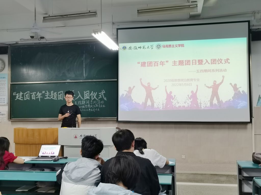 开展团日活动,共庆建团百年。5月6日晚自习,班级在行知楼2020203教室召开了“建团百年”主题团日活动暨入团仪式,团支书周勤松主持,班级全体同学参与。周勤松带领大家学习习近平总书记考察中国人民大学的重要讲话精神。紧接着,优秀团干储亚芳和优秀团员张宇涵进行交流分享发言。入团仪式在全体同学奏唱国歌中拉开序幕,新团员蔡华健和老团员代表梁羽中进行发言,仪式在全体同学齐唱团歌中结束。