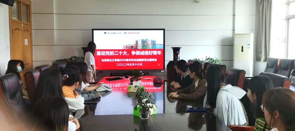 本网讯(文/摄 乔婷婷)5月16日上午,2020级全体贫困生在学院四楼第一会议室召开“喜迎党的二十大,争做诚信好青年”诚信教育主题班会。本次班会由2020级马克思主义理论专业团支书张子璇主讲,20级辅导员夏盼盼老师以及20级全体受助学生参加。