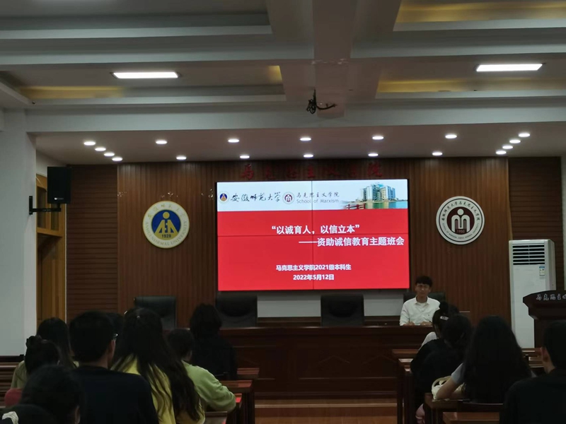 进一步培育大学生诚实守信意识,增强其社会责任感和使命感,5月12日晚,2021级本科生在学院五楼会议室开展“以诚育人,以信立本”——资助诚信教育主题班会。本次班会由2021级本科生辅导员沈镇主持,全体受资助学生参与。
