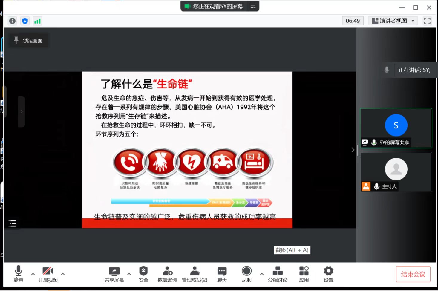 安全知识培训。孙颖医生通过线上会议向同学们系统地介绍了一些常见的突发疾病和急救方法,重点介绍了心肺复苏的流程和相关急救器械的使用方法,以便同学们在实践过程中遇到突发情况时能够保持冷静,采取正确的施救措施。