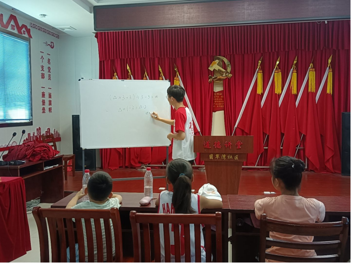 诵读经典传文化,互动数学练思维。国学经典课有序进行中,社区老师带领小朋友们温习前文后,着重强调了读书的方法之“四清法”。小朋友们纷纷表示在未来的学习中会运用其中。以数字之语,观世界之景。趣味数学课开展前,来自数统学院的陆俊余和汪根宝小老师准备了棒棒糖作为游戏的奖励。课堂伊始,小汪老师用一个关于年龄的恒等式激发小朋友们的数学兴趣,探索数学奥秘。小朋友积极性倍增,回答问题正确率也高。紧接着小陆老师和志愿者们和小朋友们一起进行了“数鸭子”和“逢七必过”小游戏,欢声笑语中提升小朋友们对数字的敏感度,对倍数的计算有了更深的理解。