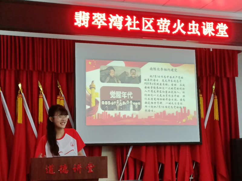 红色基因代代相传,祖国未来无限向往。志愿者崔传豪给小朋友们进行生动有趣的红色知识宣讲。立足小朋友们的认知程度,她从热播的动画片《那年那兔那些事》和电视剧《觉醒年代》的视频片段入手,引入关于党的成立知识——南陈北李,相约建党。通过讲述革命英雄的事迹,让小朋友们了解伟大的建党精神,并激励小朋友们始终保持“繁霜尽是心头血,洒向千峰秋叶丹”的赤子之心。