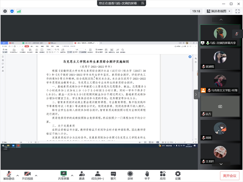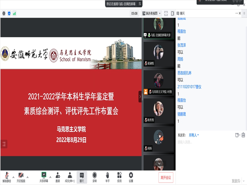 8月29日晚8点,2021级本科生线上召开2021-2022学年本科生学年鉴定暨素质综合测评、评优评先工作布置会,永利集团304am2021级全体学生参会。由辅导员沈镇主持。
