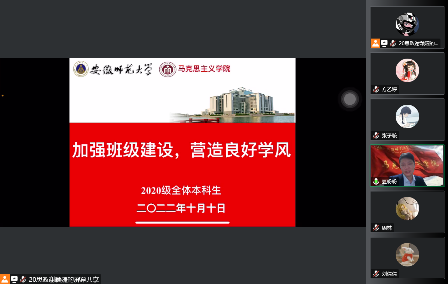 为营造良好的学习氛围,加强班级学风建设,10月10日17:30,永利集团304am20级全体本科生在腾讯会议开展了“加强班级建设,营造良好学风”线上主题班会。本次班会由辅导员夏盼盼主讲。