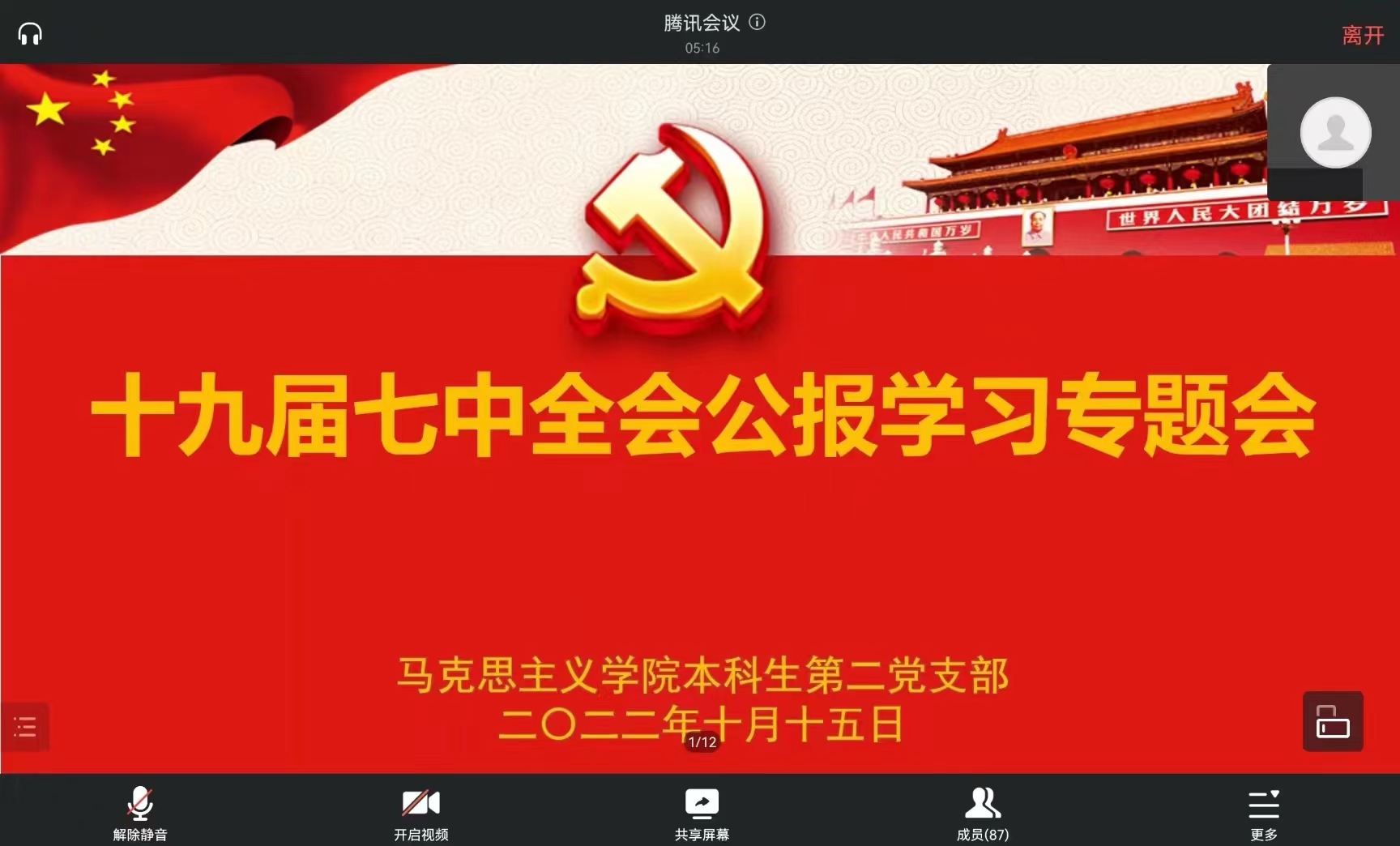 为加强党员理论素养,传达学习党的十九届七中全会精神,迎接党的二十大胜利召开。10月15日晚,永利集团304am本科生第二党支部于线上召开了党支部大会暨《十九届七中全会公报》学习专题会。会议由本科生第二党支部书记季行健主持,支部全体成员参加会议。同时,会议邀请到学院20级、21级和22级各班团学骨干及入党积极分子共140人参与理论学习。