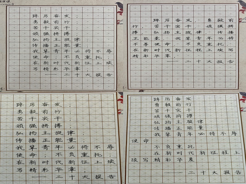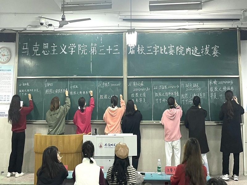 本次比赛由分别书写粉笔字、钢笔字、毛笔字三部分组成。粉笔字书写内容为“殷殷之情俱系华夏,寸寸丹心皆为家国”,旨在激励学院学子坚定理想信念、厚植家国情怀。钢笔字书写内容为“踔厉奋发、勇毅前行、苦干实干、弘扬主旋律,传播正能量,我辈青年必将不辱使命、不负重托,在新时代新征程上续写精彩华章”。毛笔字书写内容由选手围绕主题“学习二十大、永远跟党走、奋进新征程”自行选择。