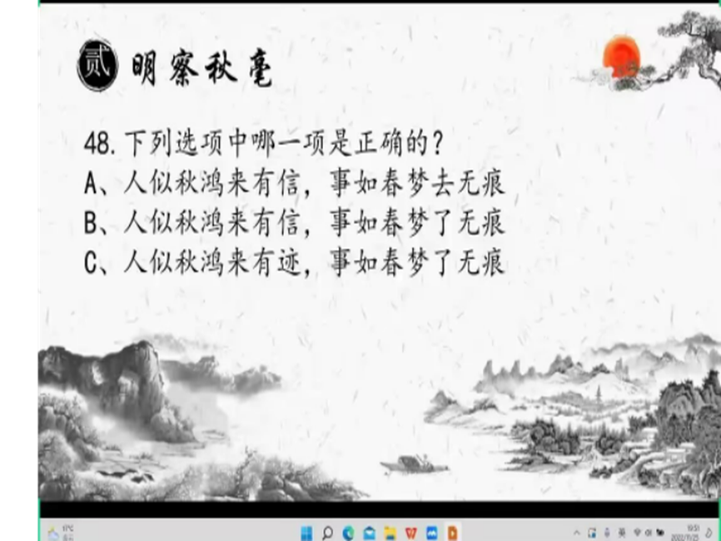 此次国学知识竞赛分为初赛、复赛、决赛三轮比试,在社团的广泛动员宣传下,会员们都积极报名参与比赛。在11月20号上午8:30国学知识竞赛初赛正式开赛,本次初赛采取线下闭卷形式进行,试卷题型多样涵盖众多国学小知识,在基础知识中徜徉国学风采,在古诗底蕴中品味秦史汉唐,在经典讨论中开放思维。共有70名优秀的选手进入第二轮复赛。第二轮初赛改为线上进行,比赛气氛高涨,选手积极进行抢答,比赛得分你追我赶,热情洒满比赛现场,有32名选手进入最终决赛。经过两轮比拼合和竞答,决赛在11月27号晚19点的线上拉开了序幕,本次决赛分为三个环节:第一环节成语数独,各位选手轮流回答问题,探寻逻辑奥秘;第二环节飞花令,各位选手轮流吟诵诗句,徜徉诗意海洋;第三环节十六宫,主持人给出十六宫格,每个小格代表一个论题,选手根据所抽的论题进行相关论述,尽显开放思维。根据最终积分,我们评选出一等奖6人,二等奖10人,三等奖16人。