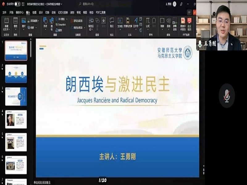 近日,304am永利集团中国特色社会主义理论体系研究会以腾讯会议的方开展了2022年秋季学期的第一次时政开讲(总第二十次)。本次活动邀请了学院优秀青年骨干教师王勇刚博士为本次主讲人,主题为“朗西埃与激进民主”。参与本次活动的还有社团指导老师王瀛培,以及中研会的各部门理事与会员。